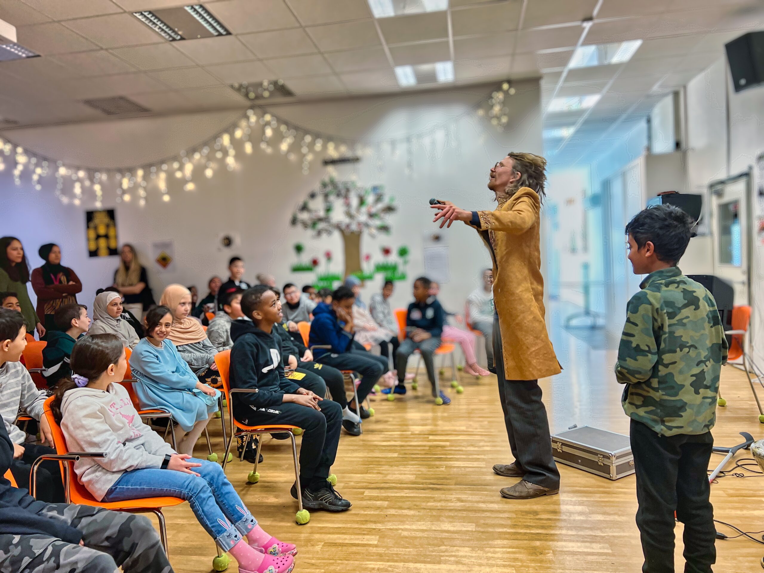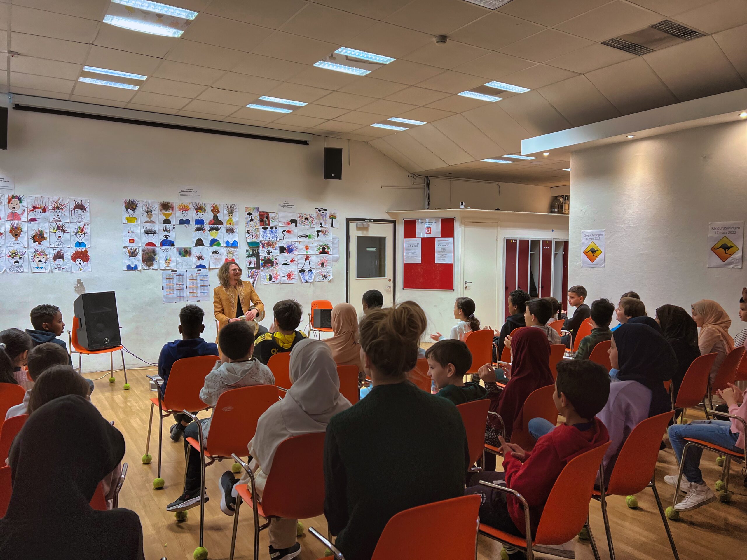 Multiinstrumentalisten Dan Knagg gjorde en storstilad entré, när han kom in i rummet hördes musiken överallt, men var hade han sina instrument? Eleverna såg förvånat på när han klappade händerna och dansade. De började röra sig i takt med hans musik och rimmade på melodierna, fortfarande förvirrade…vad är det som sker?