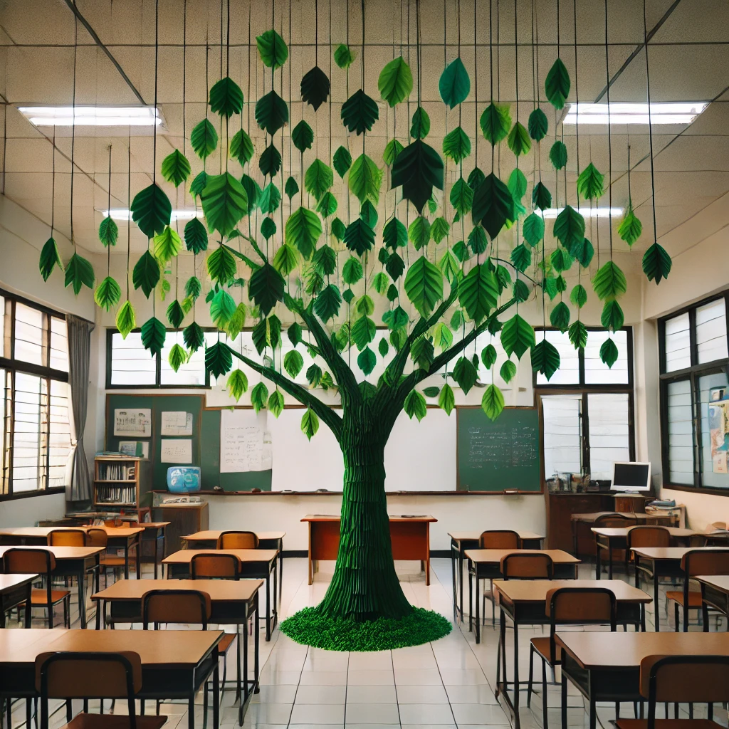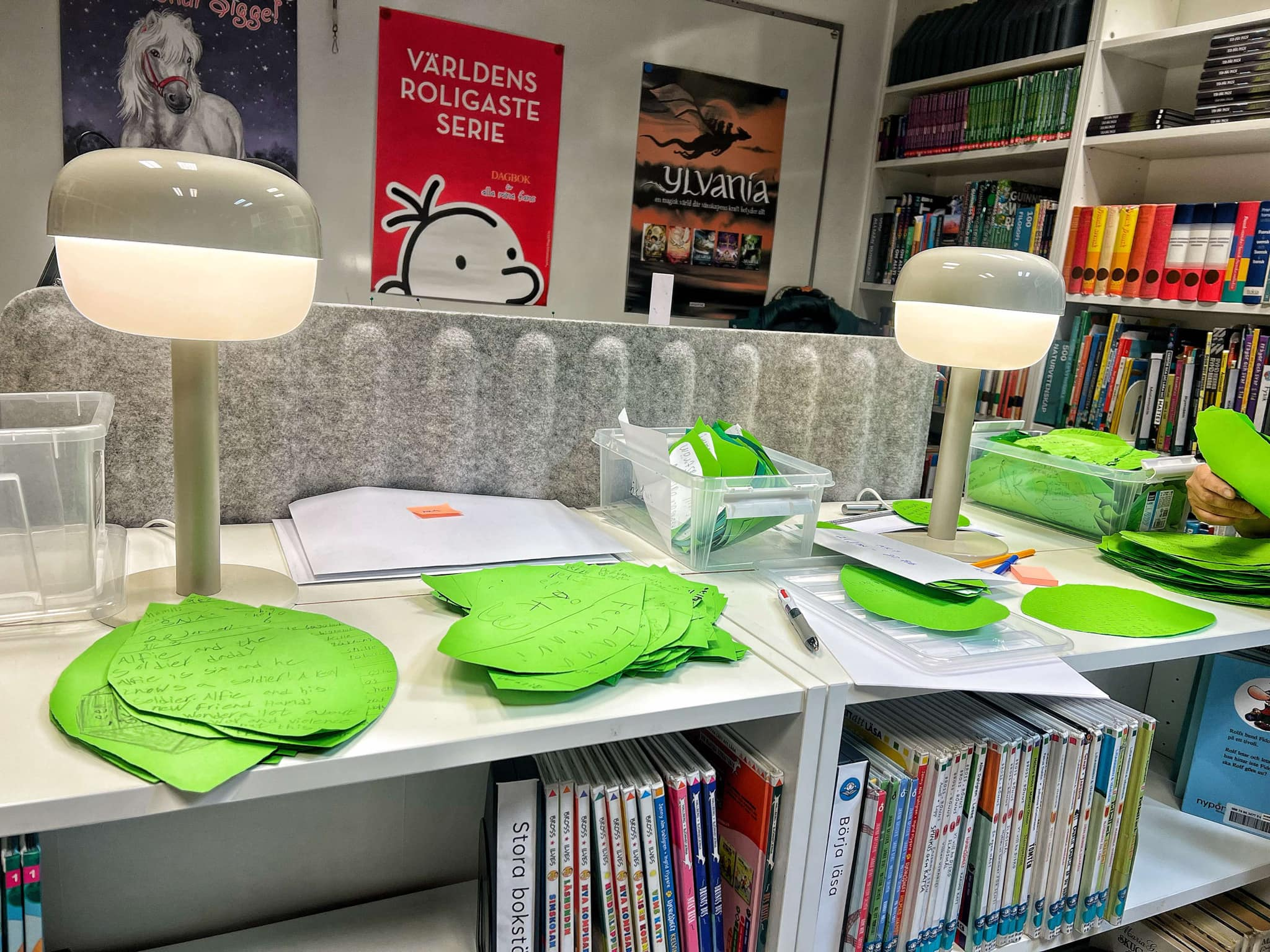 Först granskar jag och Sofia de löv som eleverna lämnar in – varje löv representerar en bok som har lästs och hängs upp i det stora trädet på skolan. Vi kontrollerar elevens namn, årskurs, bokens titel, antal sidor och en kort sammanfattning av boken.