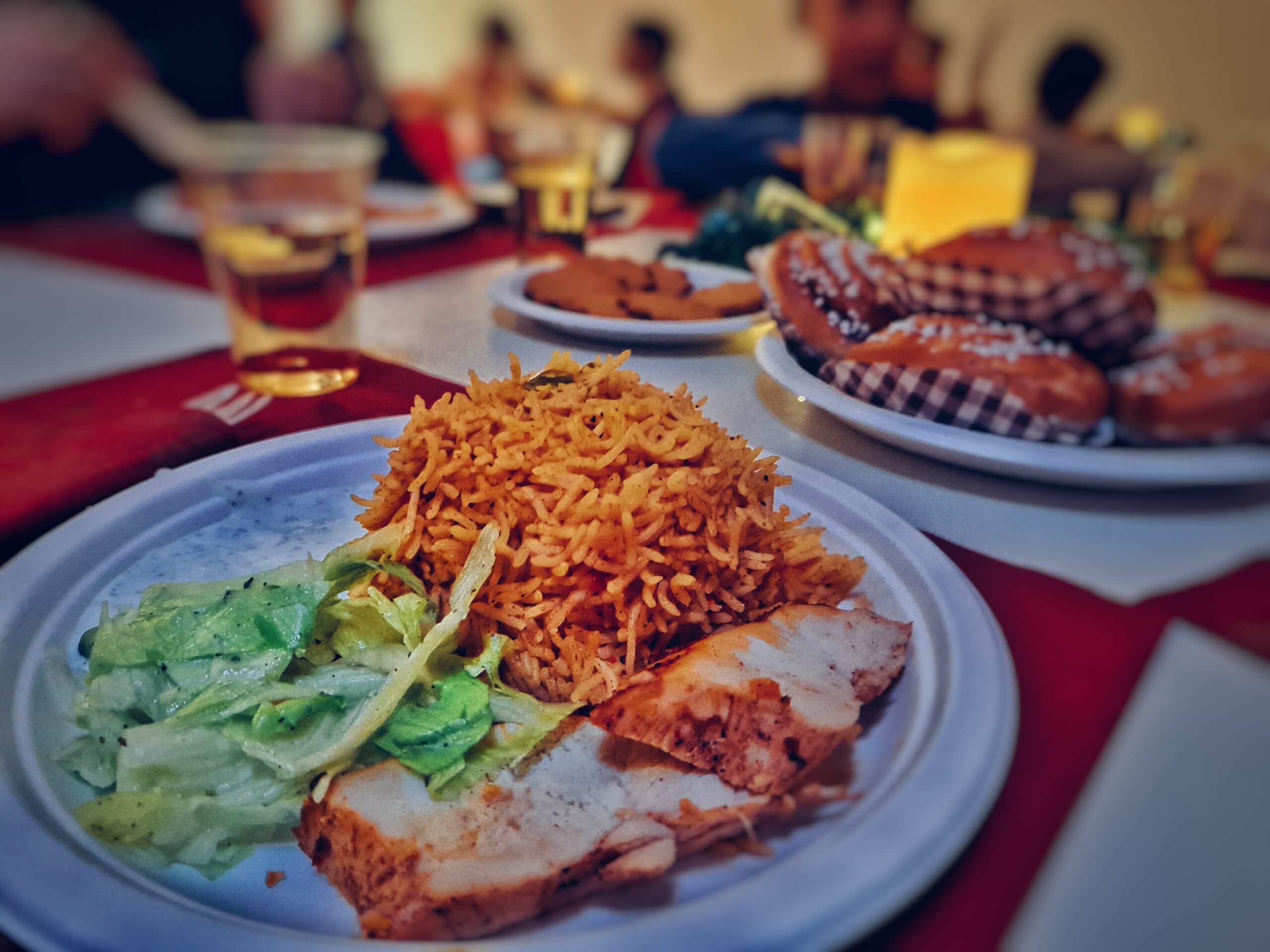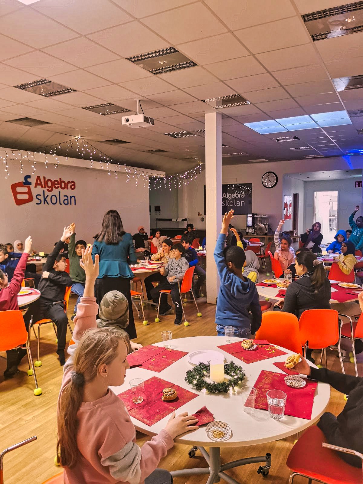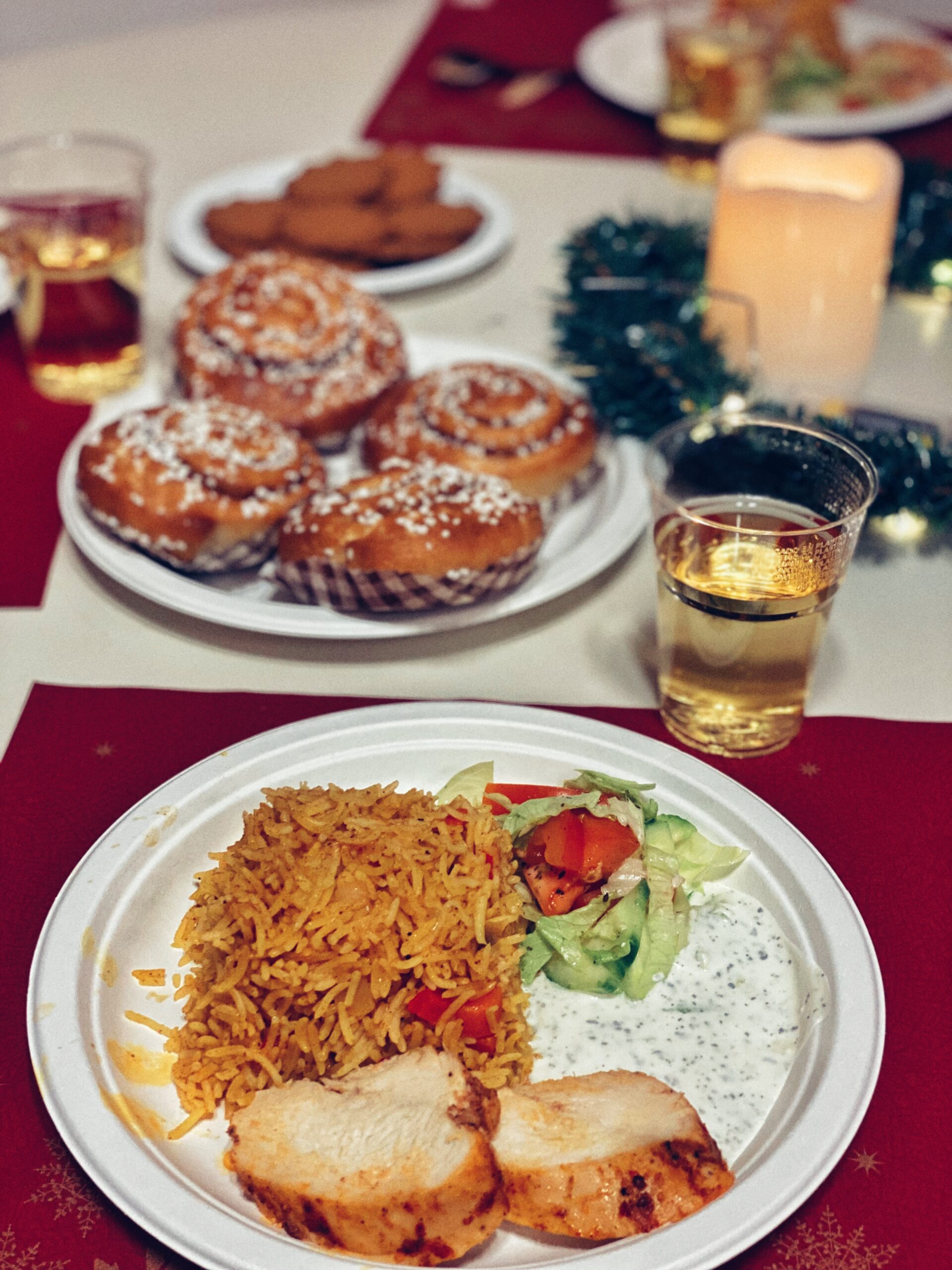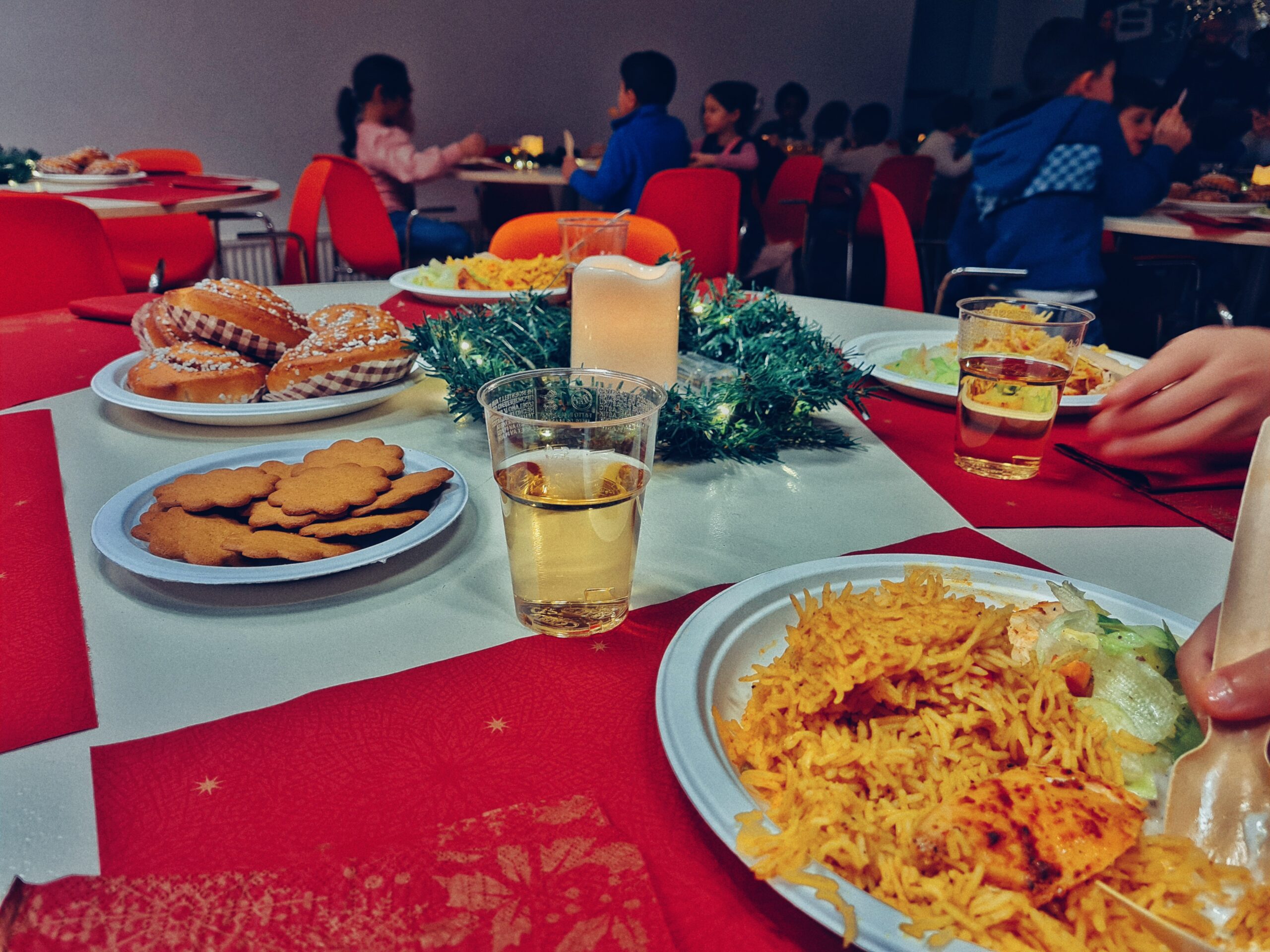 Eleverna fick för en gångs skull sin lunch serverat vid sina bord och äppeldricka serverades som dryck. Som dessert bjöds det på kanelbullar och pepparkakor.