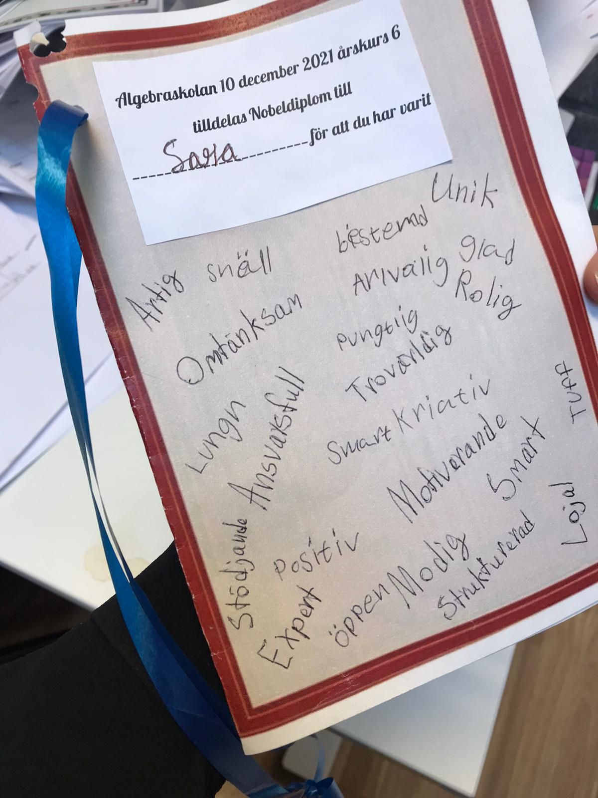 Idag har eleverna i årskurs 6 delat ut Nobeldiplom till all personal på skolan för att uttrycka sin tacksamhet och uppskattning för allt de gör för eleverna. Eleverna ville hylla personalen på skolan lite extra idag genom att skriva positiva egenskaper till varje person som jobbar på skolan från busschaufför, städare, bibliotekarie, lärare och rektor. Alla är lika viktiga och vi är tacksamma för allt de gör.