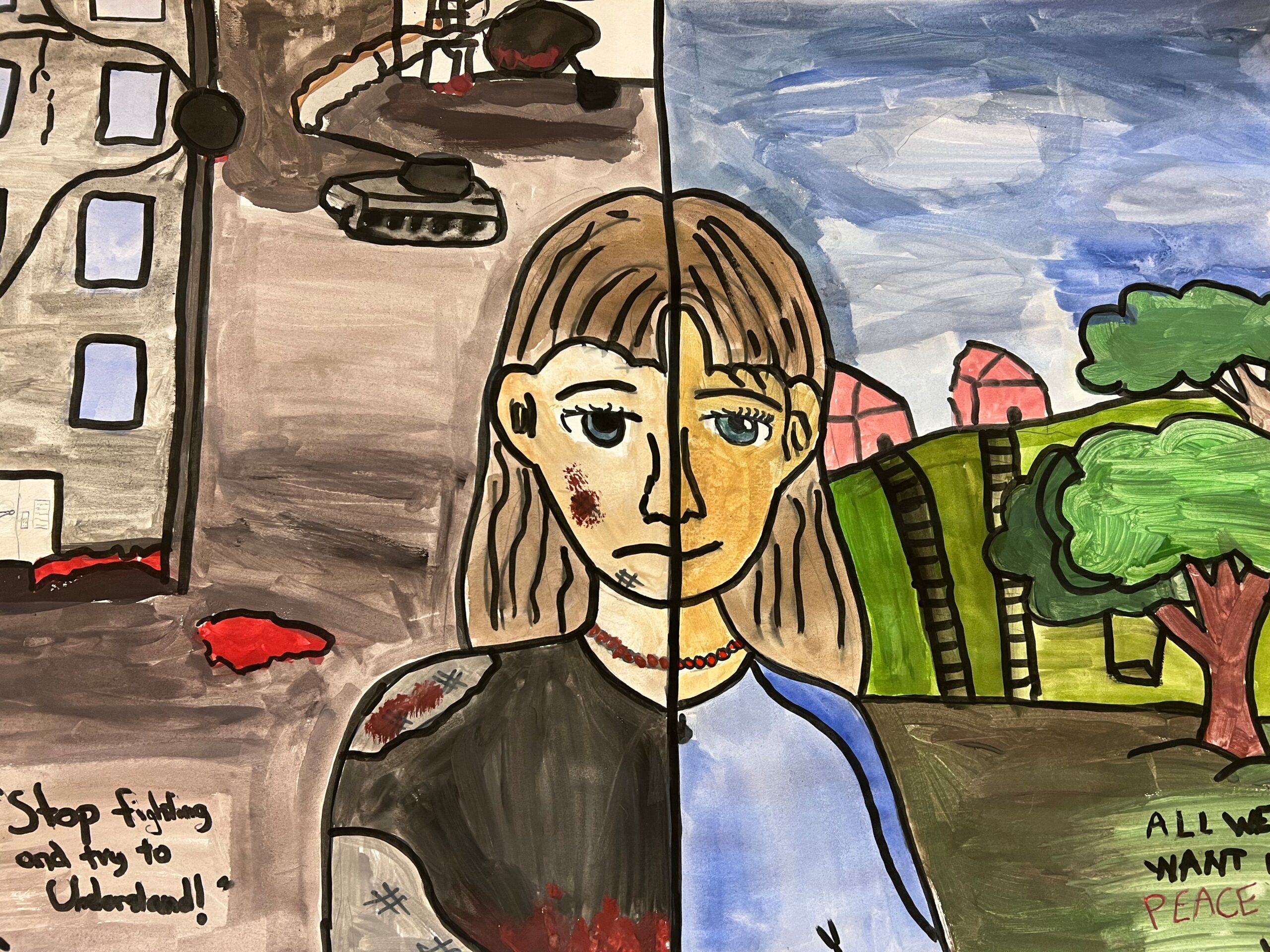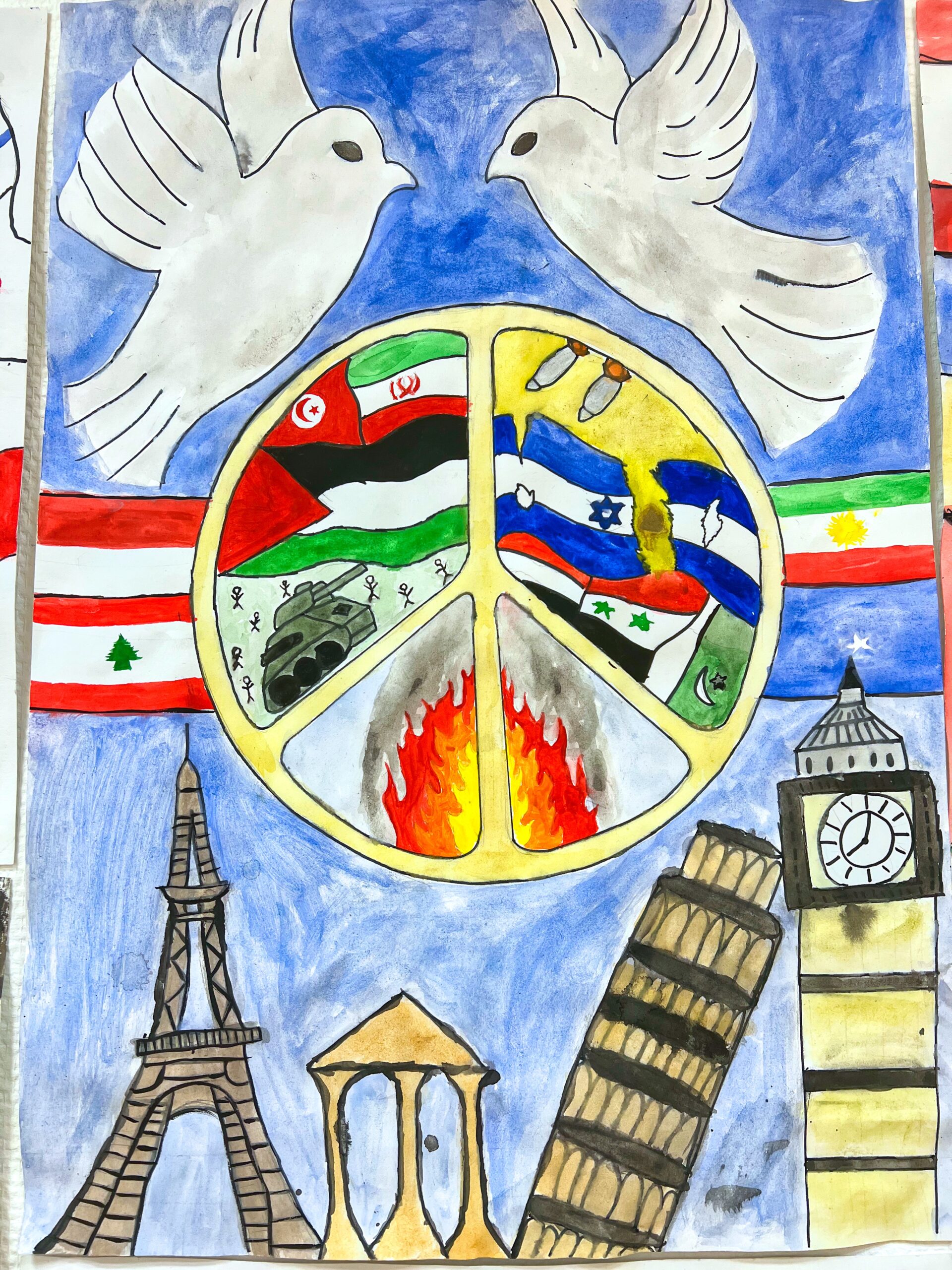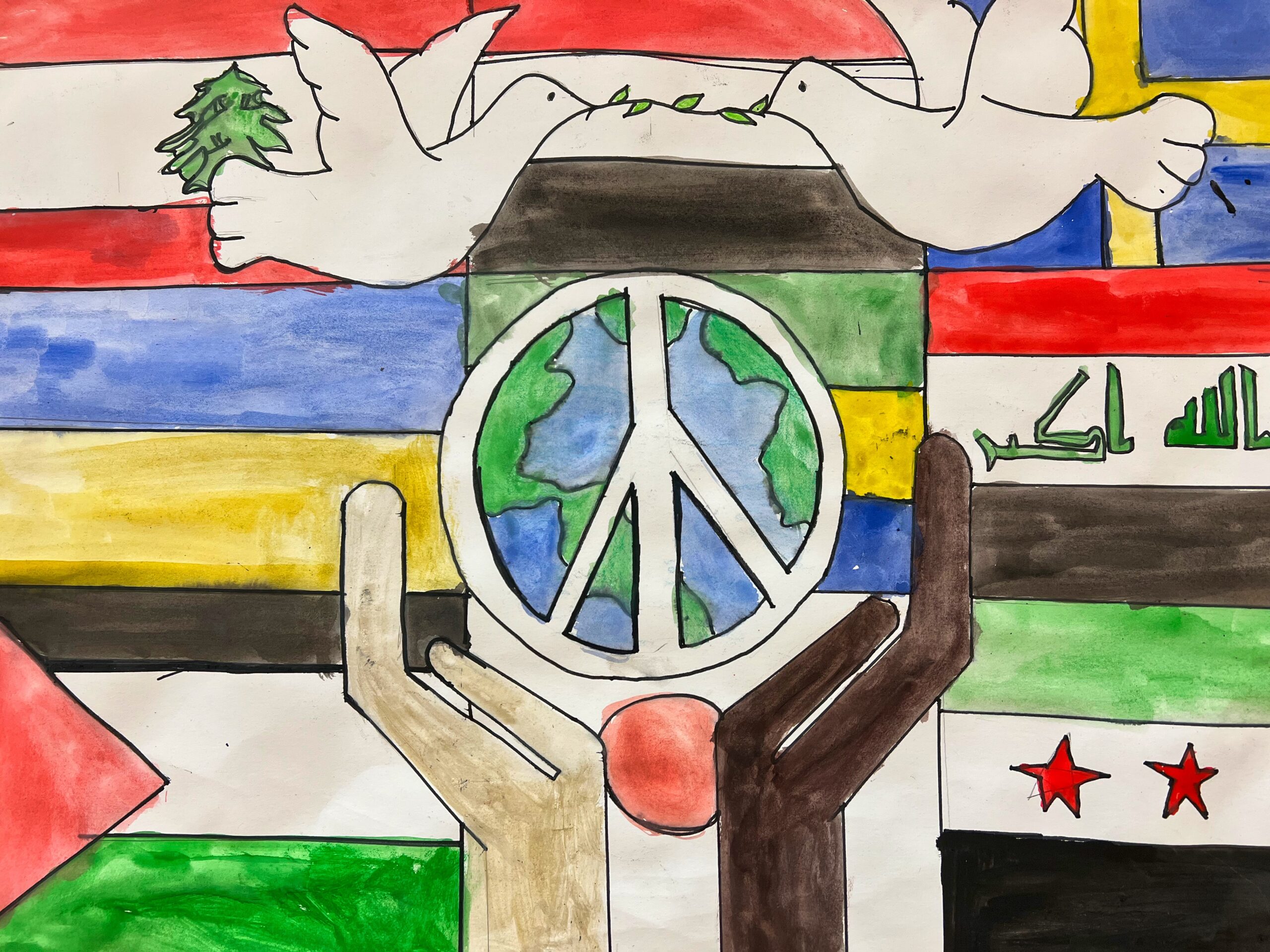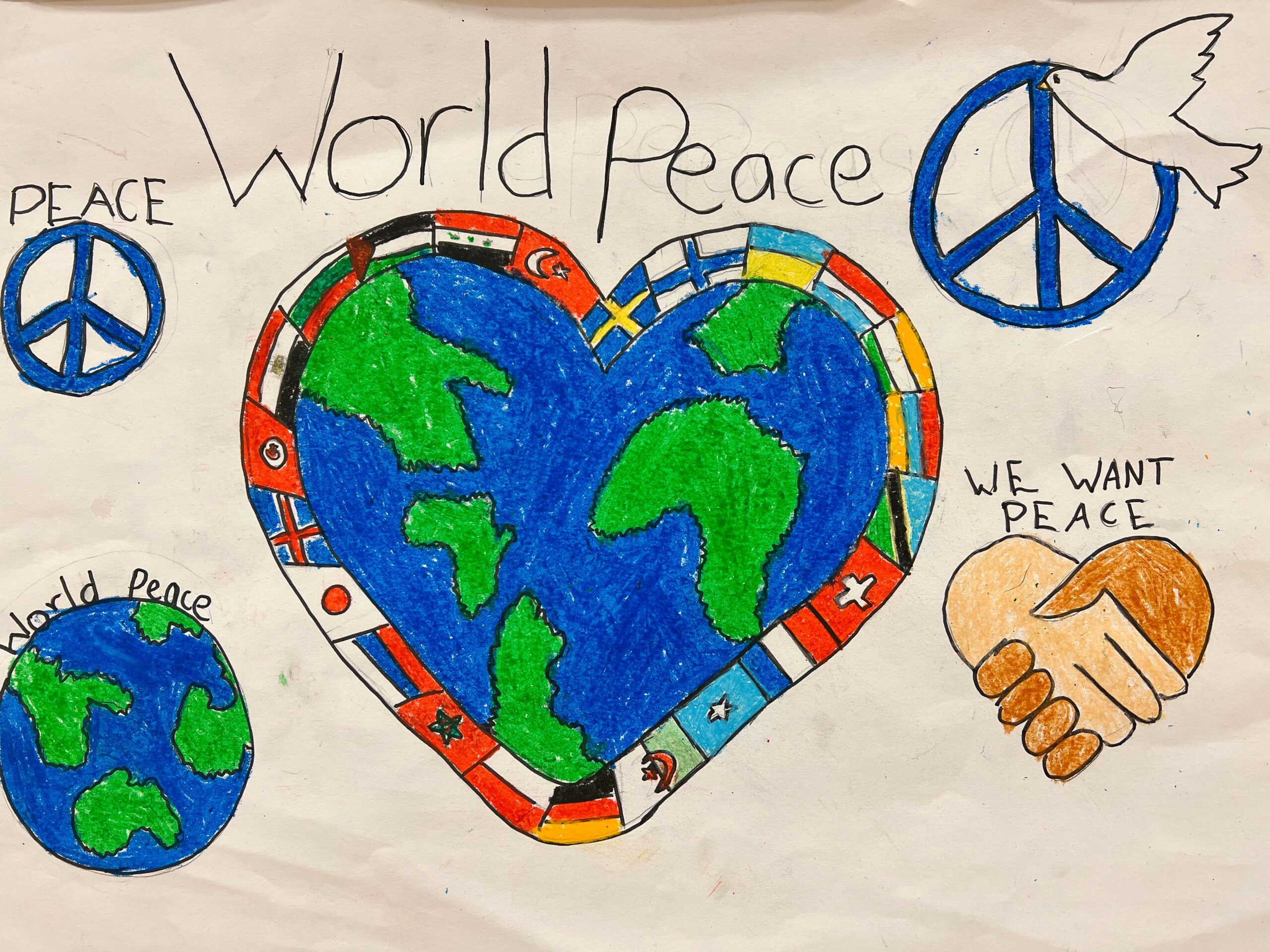En dag fick läraren Airoli, (engelska, slöjd och bild) en idé. Hon ville visa att vi bryr oss om alla dessa barn och deras familjer. Hon anordnade en tävling ”Världsfred”, där eleverna i årskurs 3-7 skulle måla sin bild av fred. På bildlektionerna fick de först skissa, sen måla och färglägga. Det blev fantastiska konstverk och personalen fick sedan rösta på vilka tre bilder de tyckte tilltalade dem mest.